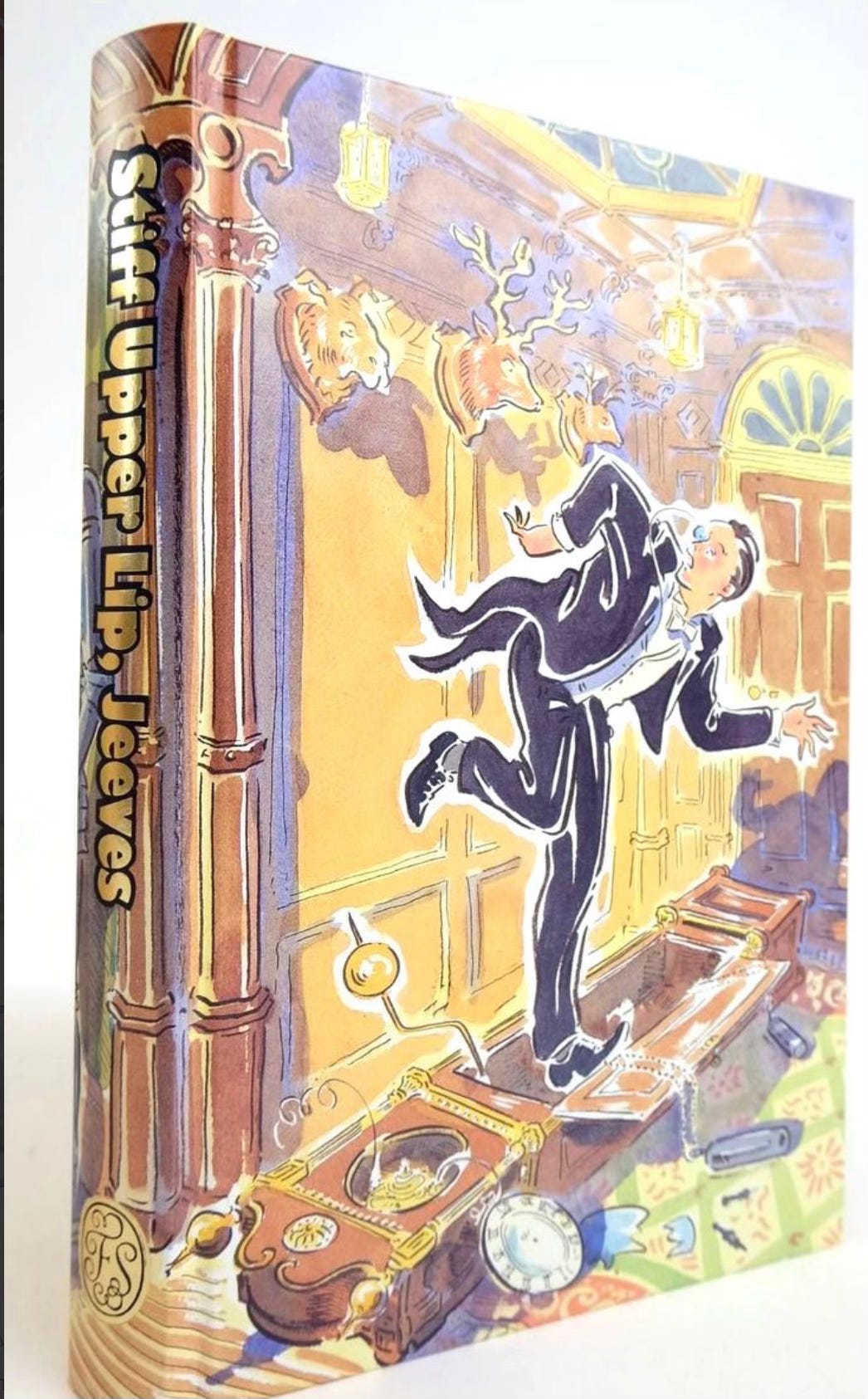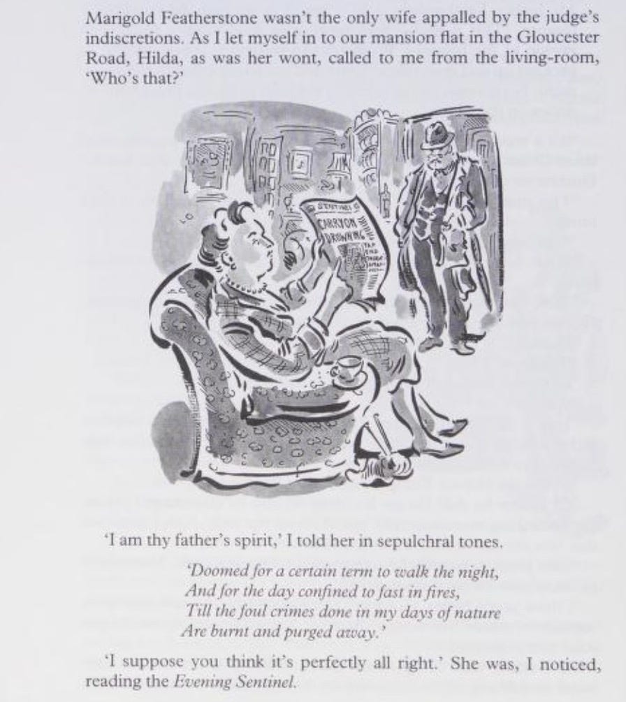 The book is undeniably enhanced by the presence of the delightful illustrations by Paul Cox, whose Instagram account offers a collection of his distinctive images. In this Rumpole volume, as well as full-page and double-page spread illustrations, there are many little vignettes, making this one of the most heavily decorated Folios in the collection. Cox is an ideal artist for this commission. His distinctive style is warm and whimsical, and the only downside to his work here is that there is none of his usual vibrant colour. All the paintings are black-and-white. Some of the colourful style Cox brought to his illustrations for PG Wodehouse stories, also in Folio, would have been welcome here. Here is one of Cox’s cover illustrations for the Folio Wodehouse.