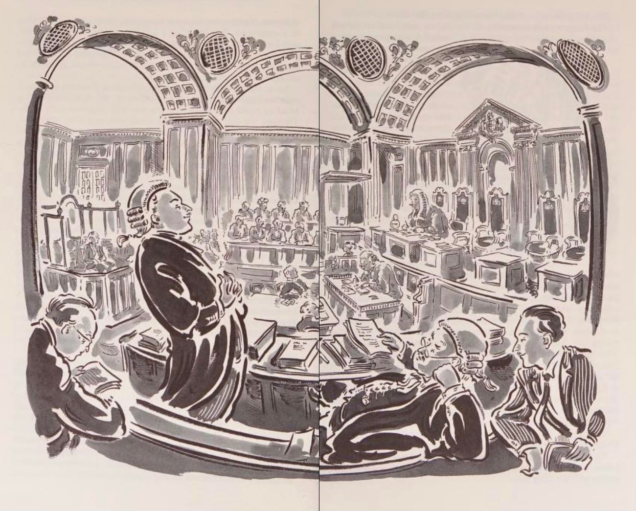 And here is Rumpole in his natural habitat, an Old Bailey court room in a double page spread: