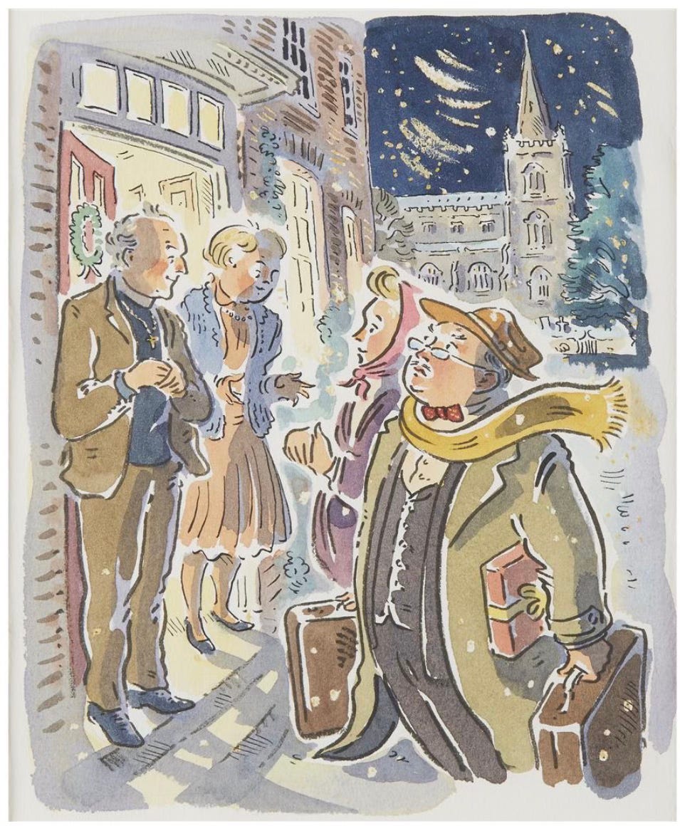 Evidently, Cox did make at least one colour illustration featuring Rumpole. This image, “Rumpole’s Christmas Party” pops up as an item sold at auction. I don’t know if this ever featured in a Rumpole book. There is a very late collection of stories, Rumpole at Christmas, which has a cover illustration by Tony Healey. The US version of this book, entitled A Rumpole Christmas, has a cover illustration by yet another artist.