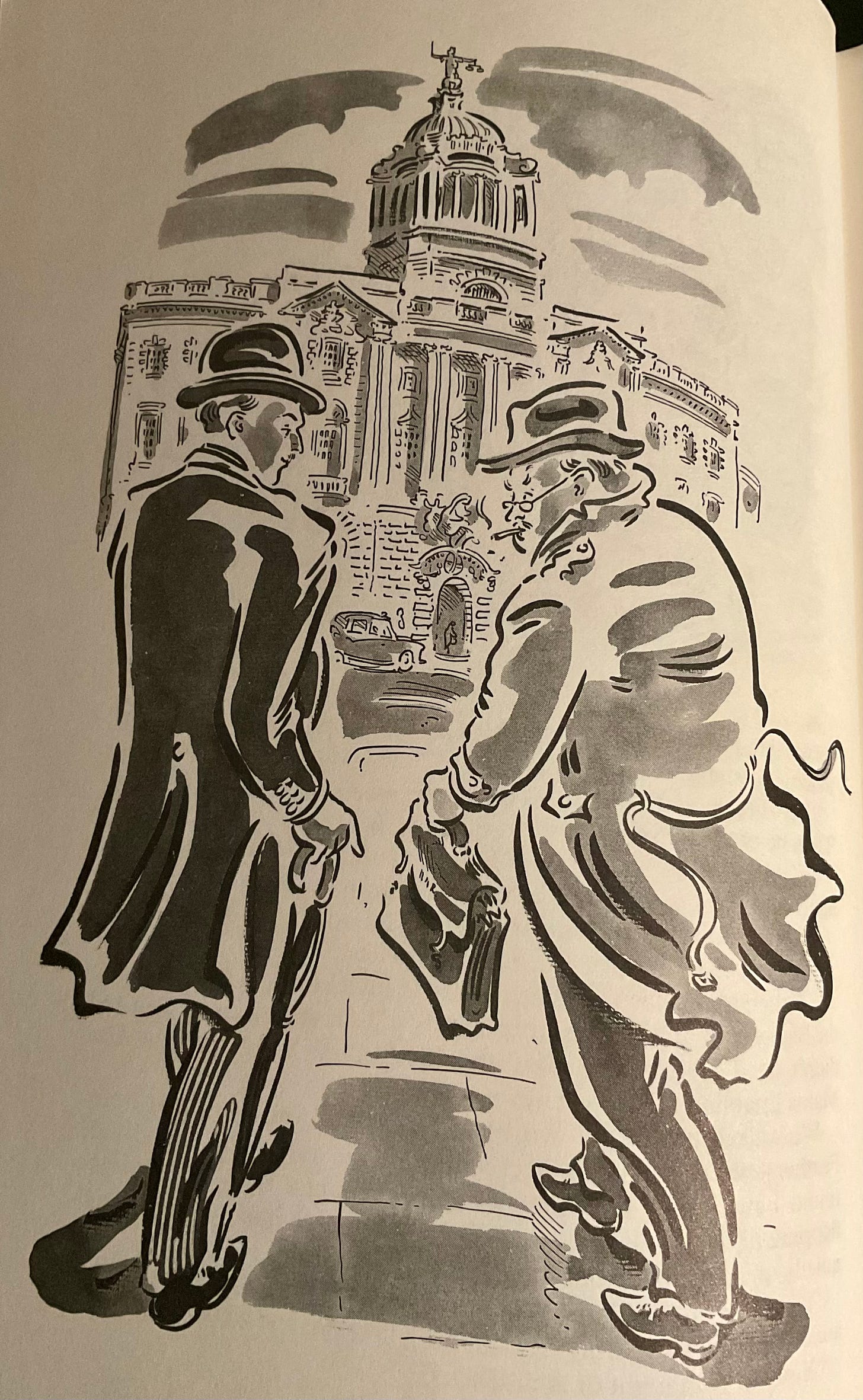 Despite their monochromicity (is that a word?) these line and wash pictures are a delight. Cox’s fluid, lively method seems ideally suited to these very British stories. Here is Rumpole on his way to the Old Bailey in the first story.