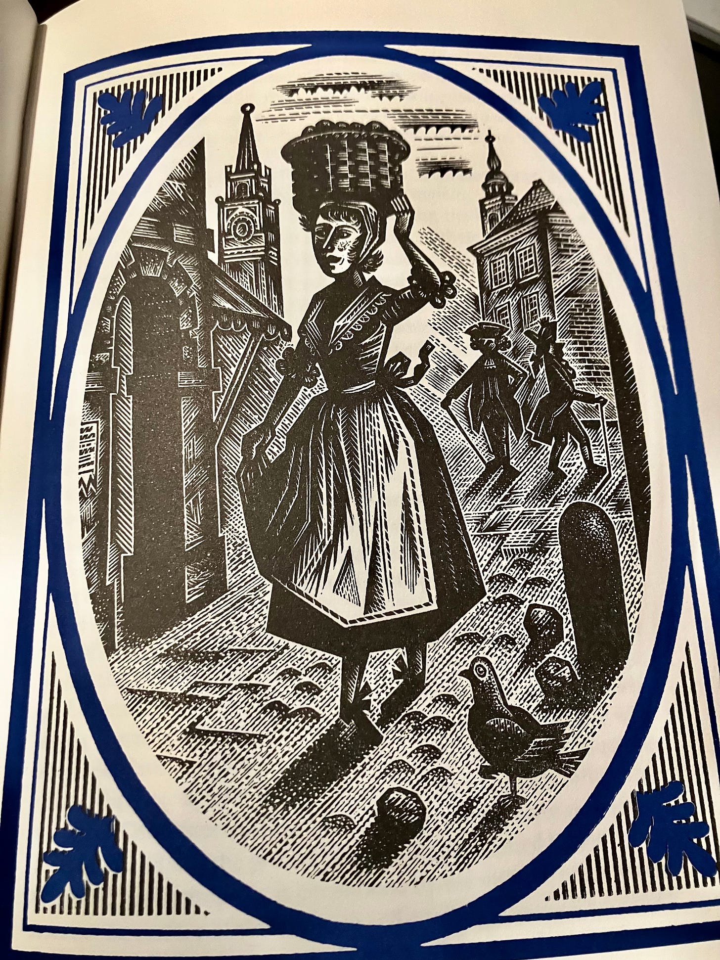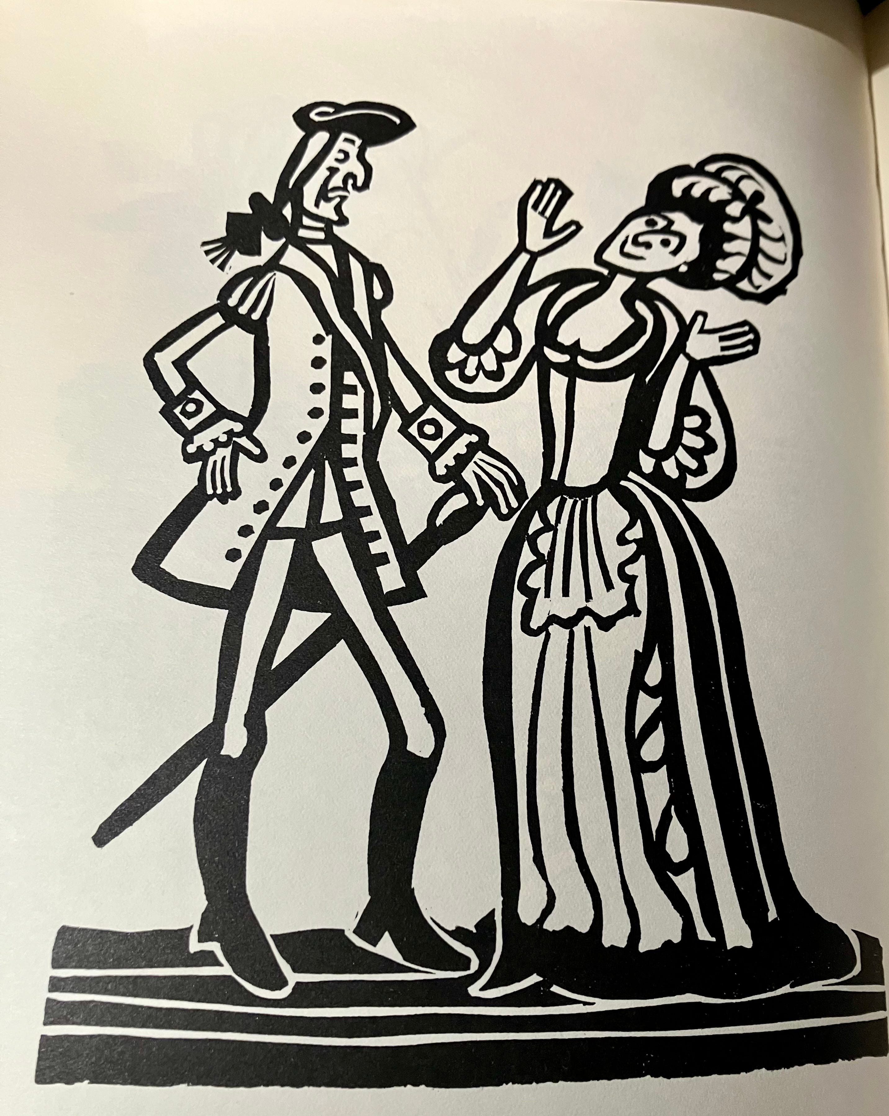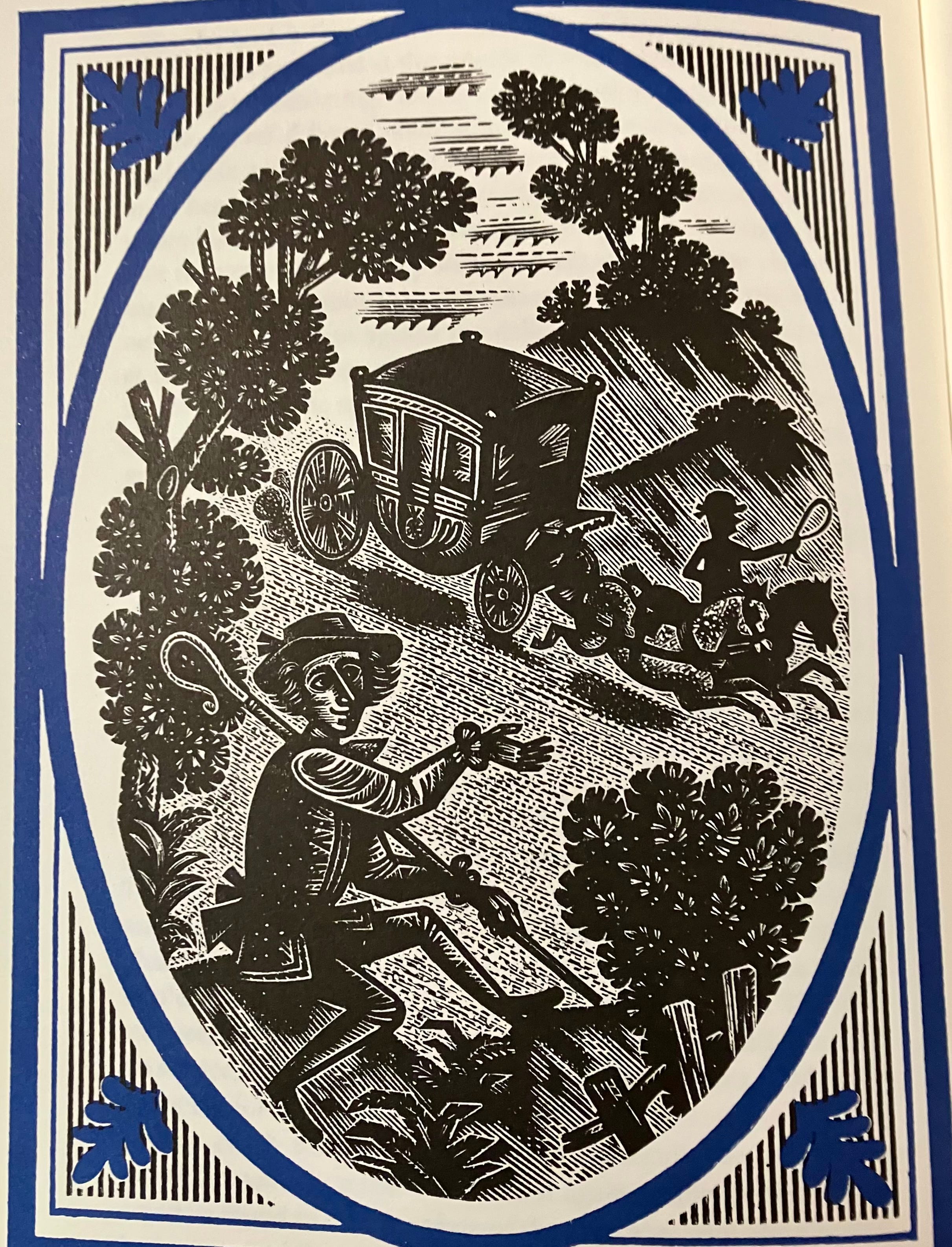 My Folio edition is the one pictured here, illustrated by Derrick Harris. It’s an edition published in 2018, with an introduction by John Sutherland, using Harris’s original illustrations from a previous Folio edition published in 1955. I really like the use of wood engravings to illustrate eighteenth-century texts: there’s something about the angularity and roughness that seems appropriate for picaresque, rollicking adventures. Derrick Harris also illustrated the Folio editions of Fielding’s Tom Jones and Joseph Andrews. A comprehensive account of his life and work is available here. Harris’s work reminds me of the Lino cuts of Edward Bawden. Back in the seventies, the Oxford English Novels series, in paperback, featured covers with linocuts by Bawden, and my student copy of Humphry Clinker was in that series. This is Bawden’s cover illustration, much reduced for the house style of the Oxford paperbacks.
